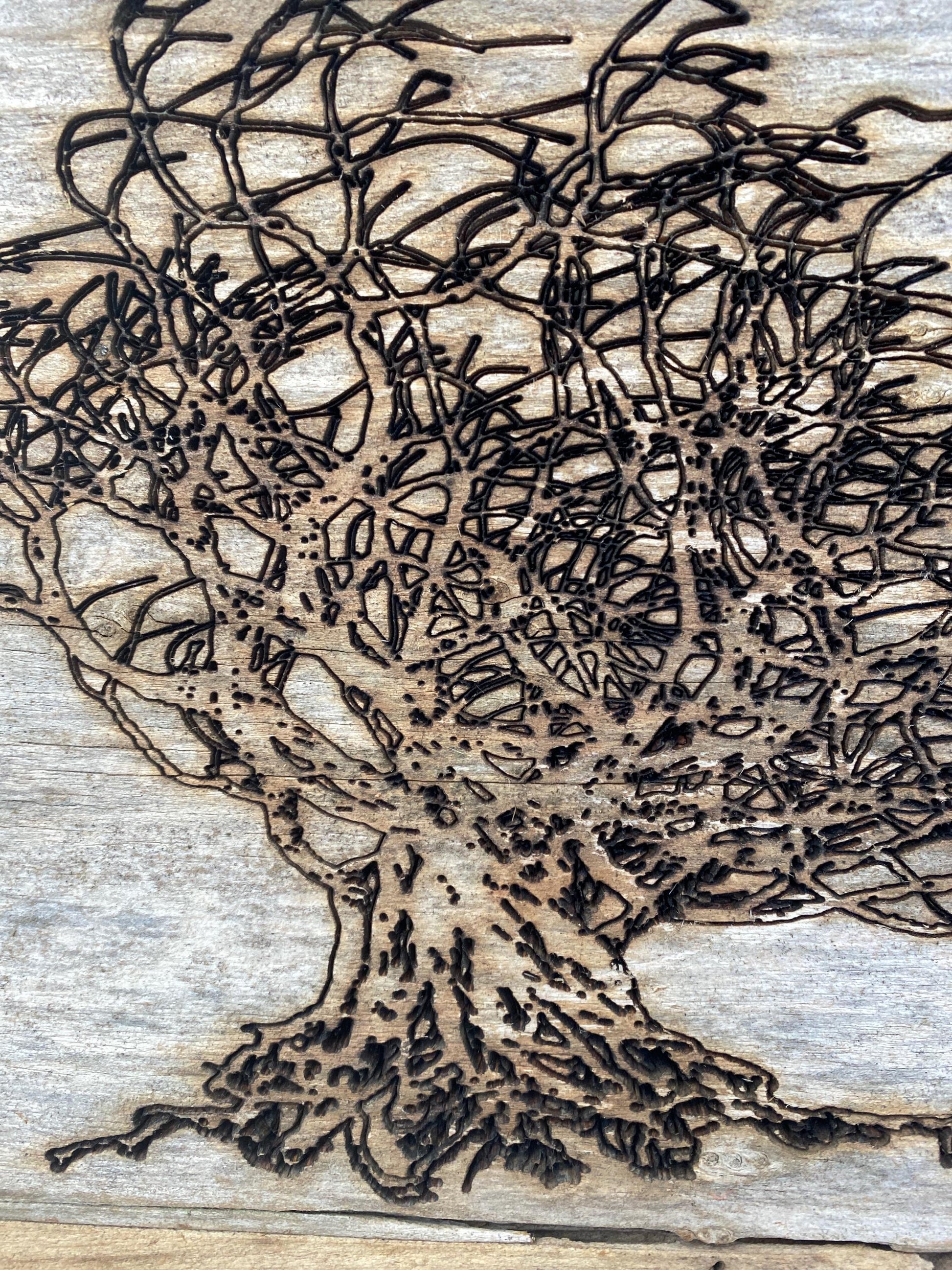 Wall Tree Art Burned Image on Reclaimed Redwood (stand not included) FREE SHIPPING
